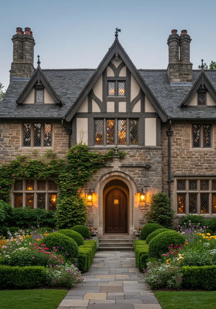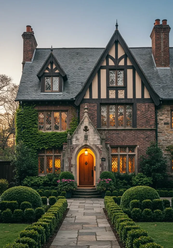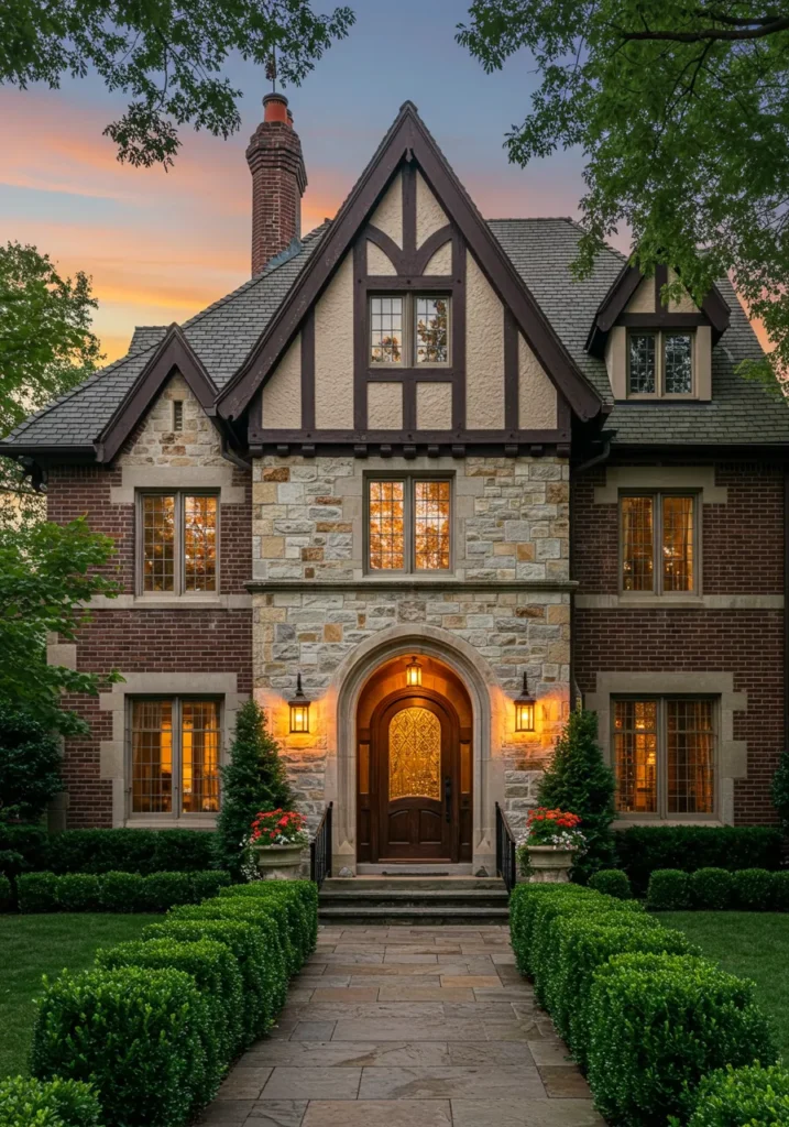 This stunning Tudor-style home exudes warmth and charm with its combination of classic brick and smooth stonework. The steeply pitched roof, large square windows, and ivy creeping up the walls create a picturesque and rustic look, while the dark wood accents provide a bold contrast. The beautifully landscaped front garden, with rounded topiary bushes and vibrant flowers, leads to the inviting wooden door framed by the arched stone entrance. Soft outdoor lighting from the lantern-style sconces adds a welcoming glow, making the home feel even more cozy as the sun sets.