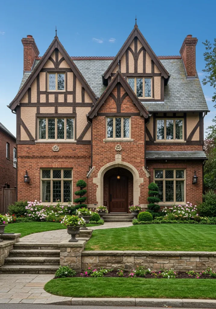 This Tudor-style home features a beautiful combination of brick and stonework, with intricate brick patterns above the windows that really make the house stand out. The steep gable roof adds a sense of grandeur, and the dark wooden beams and window frames create a bold contrast against the light brick and beige stucco. The front entrance is framed by an elegant arched stone doorway, giving the home a touch of old-world charm. The well-manicured front garden with symmetrical hedges and colorful flower beds adds an inviting touch, leading the eye towards the grand entrance.