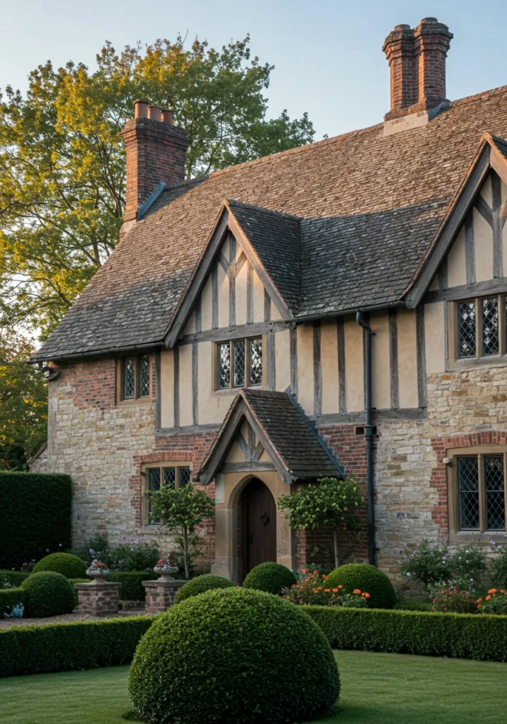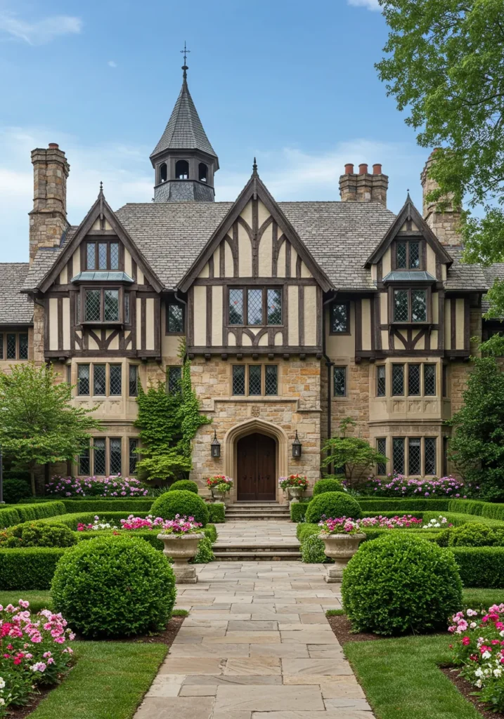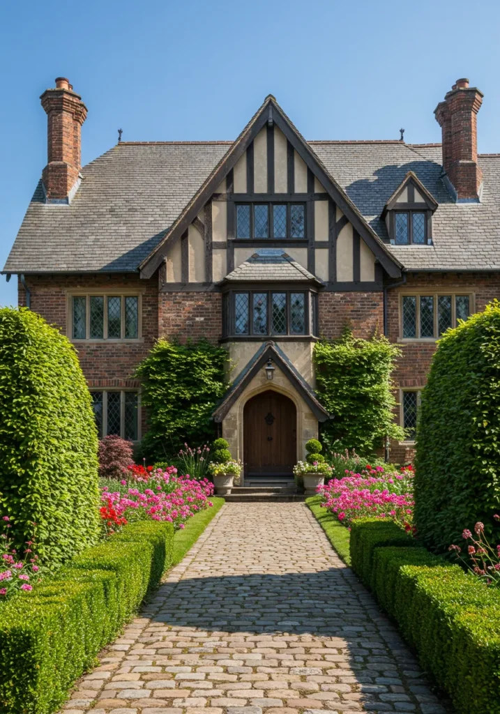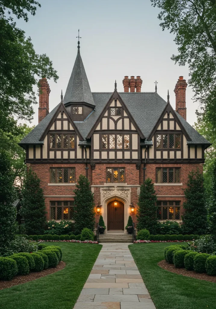 This Tudor home is a breathtaking example of grandeur, with its steep roofline and tall spires that add a fairy-tale touch. The brick and timber exterior is stunning, complemented by classic leaded windows that reflect the warm glow from inside the home. The stone archway at the entrance offers a sense of depth and elegance, while the neatly manicured garden and perfectly trimmed hedges guide you toward the inviting wooden door. The combination of greenery and brickwork creates a striking contrast, making this home both elegant and welcoming.