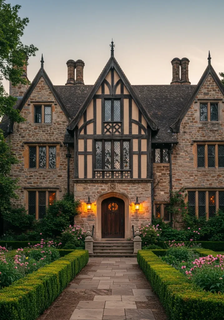 This magnificent Tudor home showcases an exquisite blend of stone and timber construction, bringing a sense of history and warmth to its grand exterior. The rich stonework contrasts beautifully with the dark timber beams, creating a dramatic yet inviting feel. The pointed gables, arched entryway, and diamond-patterned windows elevate the home’s charm, while the soft glow from the lamps adds a welcoming touch. The perfectly manicured garden, complete with neatly trimmed hedges and colorful flower beds, leads the way to the front door, enhancing the home’s curb appeal.