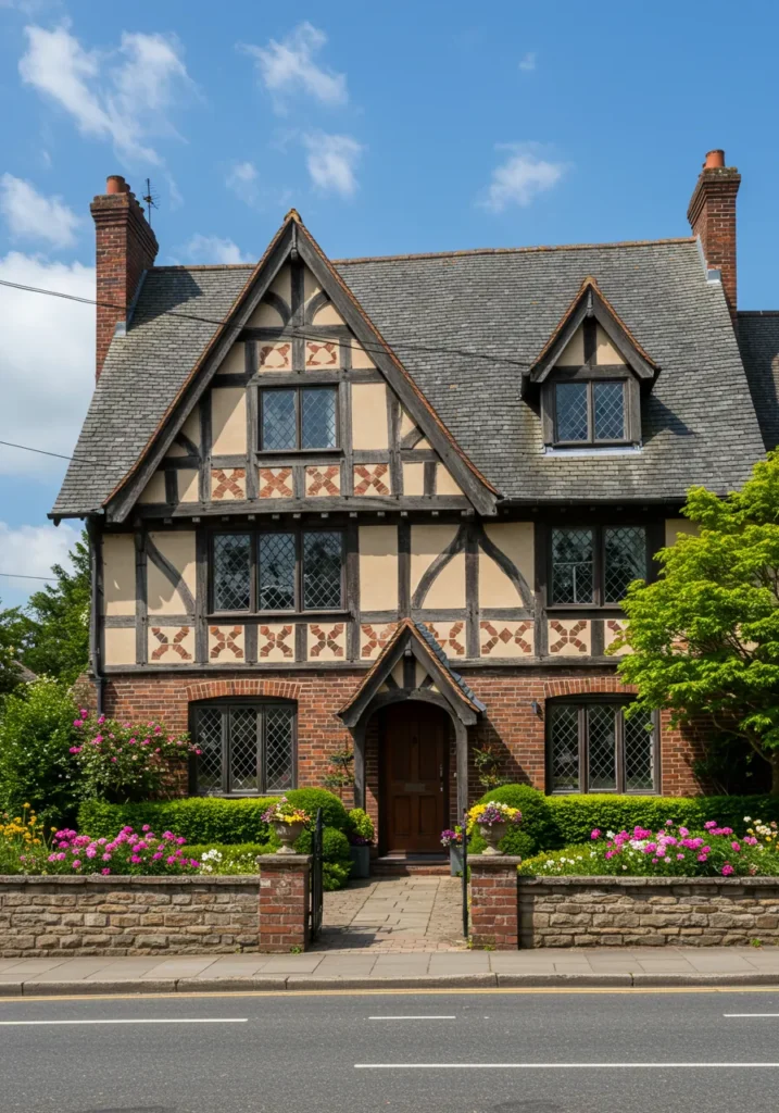 This Tudor home effortlessly combines classic elegance with a welcoming vibe. The rich red brick exterior pairs beautifully with the dark timber accents, which are a signature of the Tudor style. The intricate details in the window frames and the steep, gabled roof create a sense of grandeur, while the arched entrance gives the home a charming, inviting touch. The well-maintained garden and perfectly manicured hedges along the stone walkway lead you to the front door, making it feel like a place you’d want to call home.