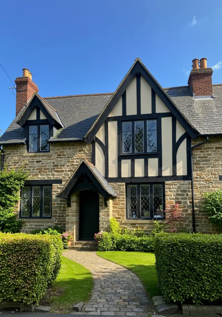 This Tudor home exudes a welcoming charm, featuring a blend of classic brickwork and dark timber beams that form the signature style of the Tudor design. The steeply pitched roof adds a dramatic element, while the classic stone archway over the front door gives it a regal touch. The cobblestone pathway, flanked by neat, rounded hedges, creates a soft and inviting entrance. The soft lighting by the door provides a warm glow, highlighting the elegant windows and creating an atmosphere of comfort and elegance.