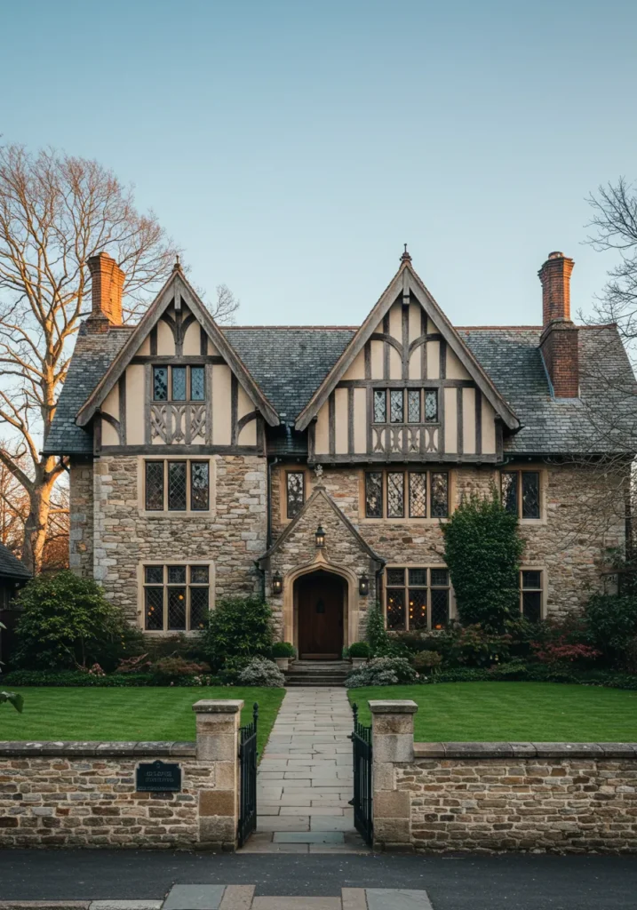 I absolutely love how this home balances the traditional grandeur of Tudor design with a welcoming vibe. The stonework and timber beams give it so much character, while the vibrant garden and warm lighting make it feel incredibly inviting. I can easily picture walking up that charming path to the front door, feeling like you’re entering a cozy haven full of charm and history. It’s one of those homes that instantly makes you feel at ease—grand yet approachable!