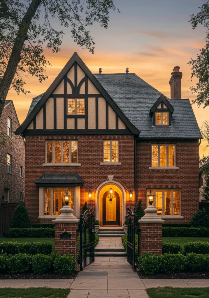 I absolutely adore the balance this home strikes between elegance and coziness! The contrast between the bold brick and dark wood creates such a sophisticated look, while the lush greenery adds a welcoming touch. The soft glow from the lamps along the entrance path creates a warm, inviting atmosphere, making this Tudor home the perfect mix of grandeur and comfort. I can easily picture relaxing evenings in such a beautiful, timeless home—it’s truly a perfect blend of classic charm and modern warmth!