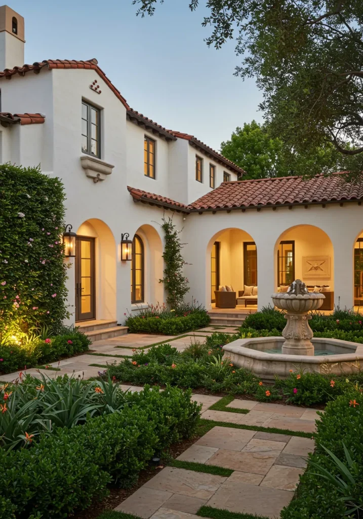 This stunning villa is the perfect blend of traditional Mediterranean style and modern luxury. The elegant arched windows, the rustic terracotta roof, and the lush greenery that surrounds the house create a welcoming atmosphere. The central courtyard features a beautiful stone fountain, adding to the serene and peaceful vibe of the home. The use of natural stone paving and carefully placed plants creates a sense of harmony and balance, making this home feel like a private oasis.