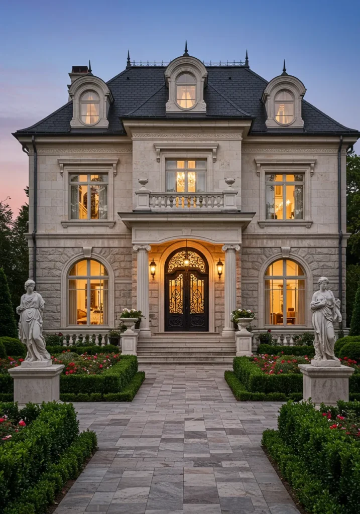 This villa features a stunning classical design with a beautiful limestone facade and large windows that offer a bright and welcoming atmosphere. The front is adorned with towering columns and an intricately designed entryway, adding a sense of grandeur. The symmetrical design and delicate detailing around the windows and doors enhance the home’s timeless elegance. The beautiful manicured landscaping, along with the statuesque figures flanking the entrance, makes this villa feel both sophisticated and inviting.