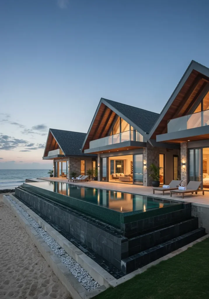 This luxurious beachfront villa boasts a striking contemporary design, with bold, sharp lines that create a beautiful contrast against the soft, natural surroundings. The roofline features a classic gable shape, while expansive glass windows allow for unobstructed views of the ocean. The open-concept living spaces flow seamlessly into the outdoors, leading to an impressive infinity pool that appears to spill into the sea beyond. The design uses clean materials like stone and wood, adding texture and warmth to the modern aesthetic.