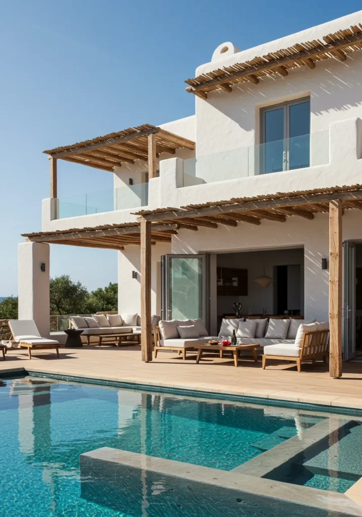 This stunning villa embodies modern elegance with its pristine white facade and natural wood accents that complement the surrounding landscape. The spacious outdoor area seamlessly integrates with the interior, offering a perfect transition from indoors to the relaxing poolside. The wooden pergola above provides shade and warmth, while large windows allow the beautiful sunlight to flood the space. The minimalist furniture arrangement exudes comfort, while the low-maintenance landscaping adds a touch of natural beauty to the surroundings.
