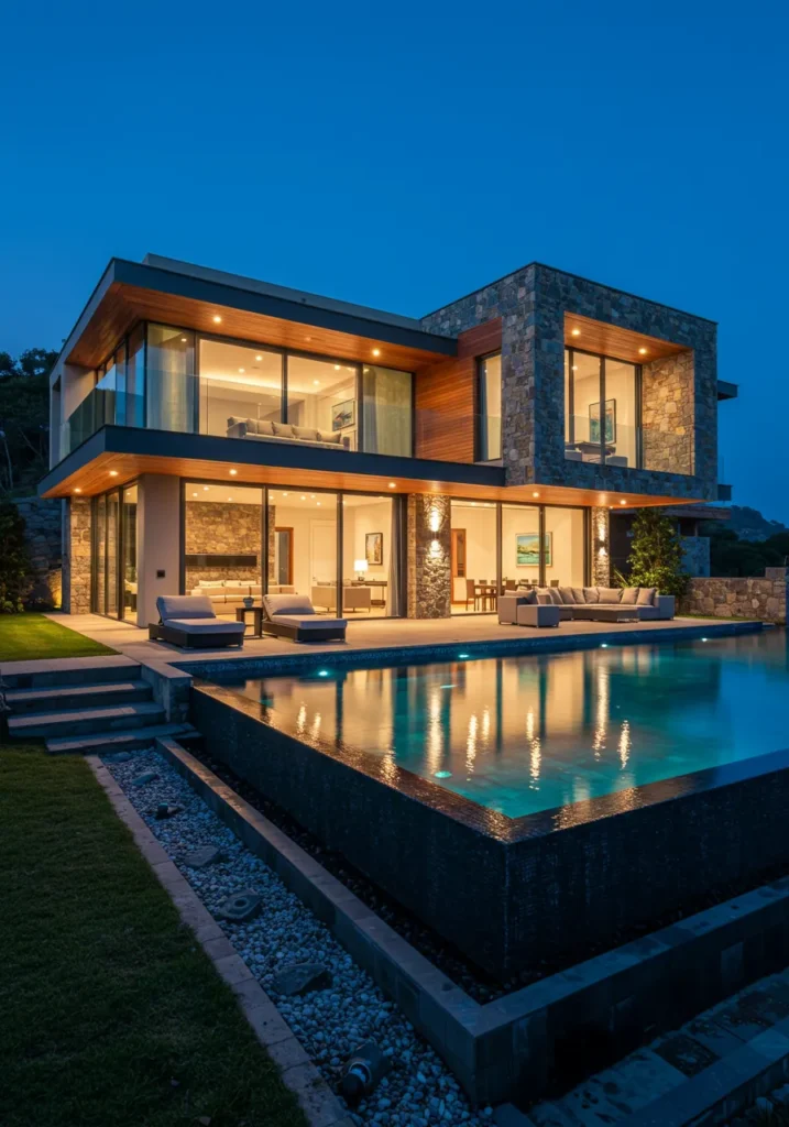 This stunning modern villa boasts a sleek design with large glass windows that open the interior to breathtaking views. The beautiful stone cladding adds texture and depth, while the wooden accents soften the contemporary lines of the building. The expansive patio area is perfect for outdoor living, with stylish lounge furniture and a pristine pool that mirrors the villa’s architectural elegance. At night, the villa is beautifully lit, casting a warm glow on the surrounding landscape and highlighting the unique features of the home.