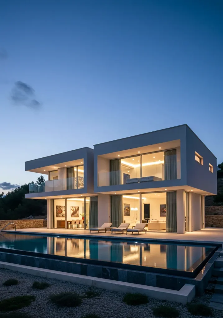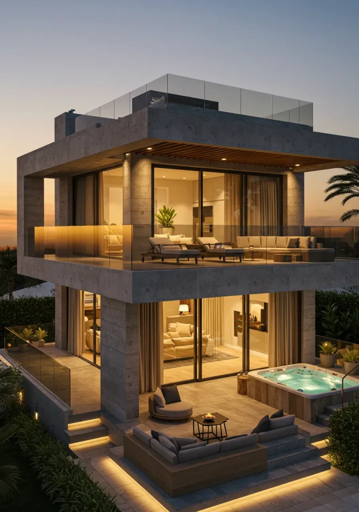This ultra-modern villa boasts sleek, cutting-edge architecture that effortlessly merges luxury with functionality. The house is designed with sharp, geometric shapes and clean lines, offering large open spaces that promote a sense of freedom. Its rooftop deck, complete with stylish lounge chairs, provides an unobstructed view of the surrounding cityscape, while the infinity pool reflects the beauty of the night sky. The elegant blend of concrete, wood, and glass ensures both durability and style, creating a contemporary masterpiece that feels like it belongs in a futuristic movie.