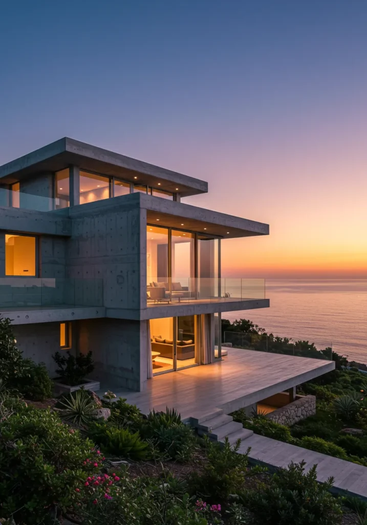 This modern villa boasts a striking architectural design with clean lines, a concrete facade, and floor-to-ceiling windows that bring the breathtaking ocean views right into the heart of the home. The spacious outdoor area extends seamlessly from the living space, with a large terrace and minimalist pool area that seem to flow directly into the horizon. The villa’s sleek design combines natural materials like stone and concrete, creating a perfect balance between modern luxury and the raw beauty of nature.