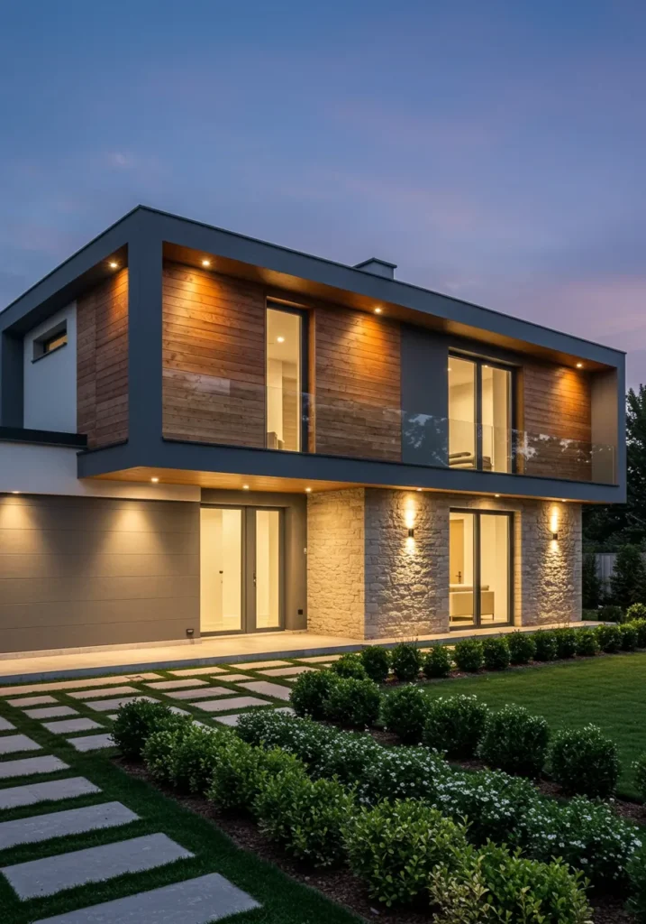 This sleek, modern villa strikes the perfect balance between contemporary design and natural elements. The exterior features a striking combination of stone and wood, with clean lines and large glass windows that bring the outdoors in. The minimalist aesthetic is enhanced by the surrounding lush greenery, with carefully arranged plants and pathways guiding you to the entrance. At night, the villa comes alive with soft lighting, accentuating its sharp angles and creating a warm, welcoming atmosphere.