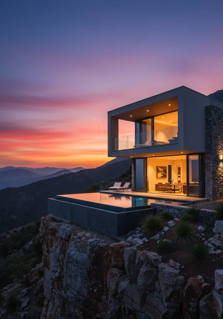 This sleek modern villa is perched atop a cliff, offering unparalleled panoramic views of the surrounding mountains and valleys. The home features sharp, contemporary lines and a minimalist design that blends effortlessly with its natural environment. The expansive floor-to-ceiling windows allow natural light to flood the space, creating an airy and open atmosphere. The infinity pool, seamlessly connected to the living area, gives the illusion of blending into the landscape, further enhancing the villa’s stunning connection to its surroundings.