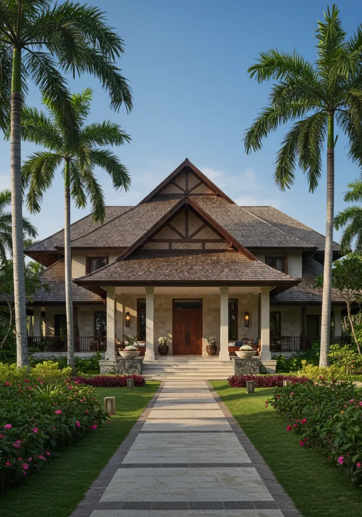 This stunning tropical villa boasts an inviting and elegant facade, with tall palm trees framing the front of the house. The lush, green garden and neatly laid stone pathway lead up to a grand, well-lit entrance. The house features a traditional yet refined design with a steep, gabled roof and a combination of natural stone and warm wooden accents. The spacious front porch creates a cozy, welcoming atmosphere, perfect for outdoor lounging or enjoying a cup of coffee on a quiet morning.