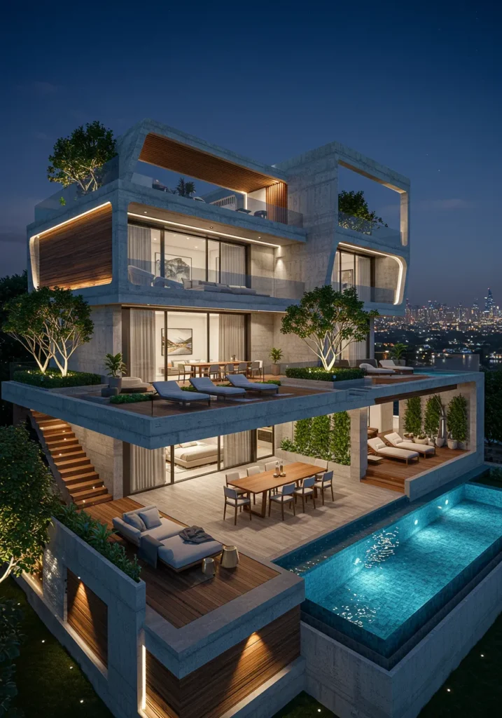 I’m completely in love with how this design feels both bold and sophisticated. The combination of wood accents and smooth concrete gives it a grounded, natural feel, yet it still screams modern luxury. Imagine unwinding by the pool as the city lights twinkle in the distance—this villa just oozes style and relaxation. It’s the kind of home you’d never want to leave, where every evening feels like a special occasion. It’s sleek, it’s stunning, and it’s definitely a dream home in my eyes!