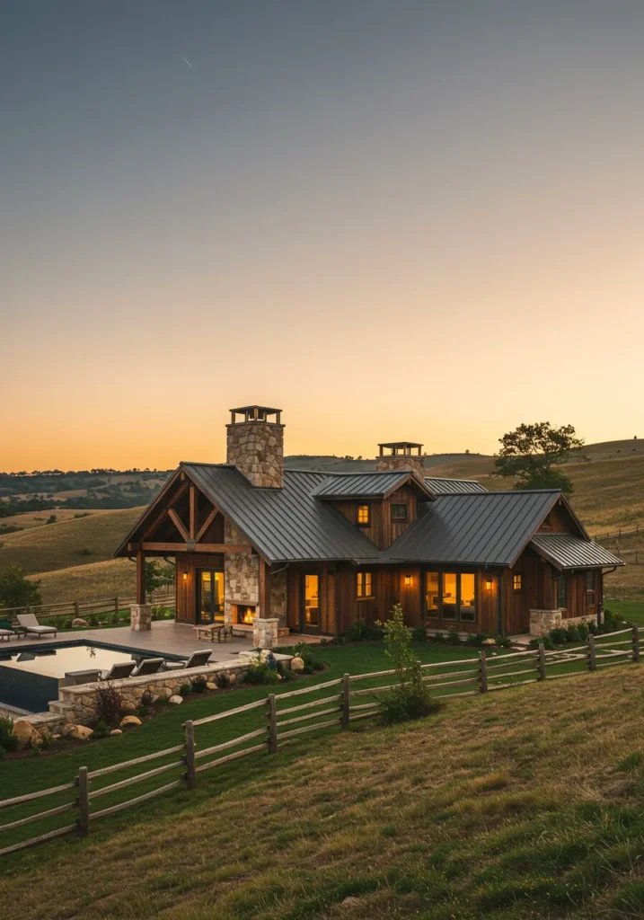 This charming rustic villa blends country warmth with luxurious finishes. The house features a striking mix of stone and wood, with large windows that invite natural light into the open, airy spaces. The sloping roof with its dark metal panels adds a contemporary touch, while the stone chimney gives it a cozy, traditional feel. The outdoor living area includes a pool, perfect for relaxing and taking in the expansive views of the rolling hills that surround the home. It’s a perfect retreat for anyone who loves peace, privacy, and nature.