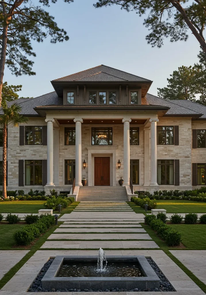 What I love about this design is how it manages to feel both regal and homey at the same time. The stately columns and stonework give it a sense of history, while the well-manicured garden and modern touches bring it into the present. I can’t help but picture myself enjoying a leisurely stroll up those steps, feeling like royalty while still completely at home. It’s the perfect balance of sophistication and warmth, and honestly, who wouldn’t love a home like that?