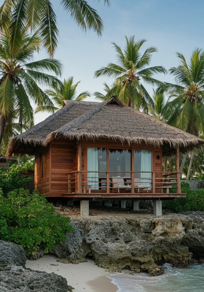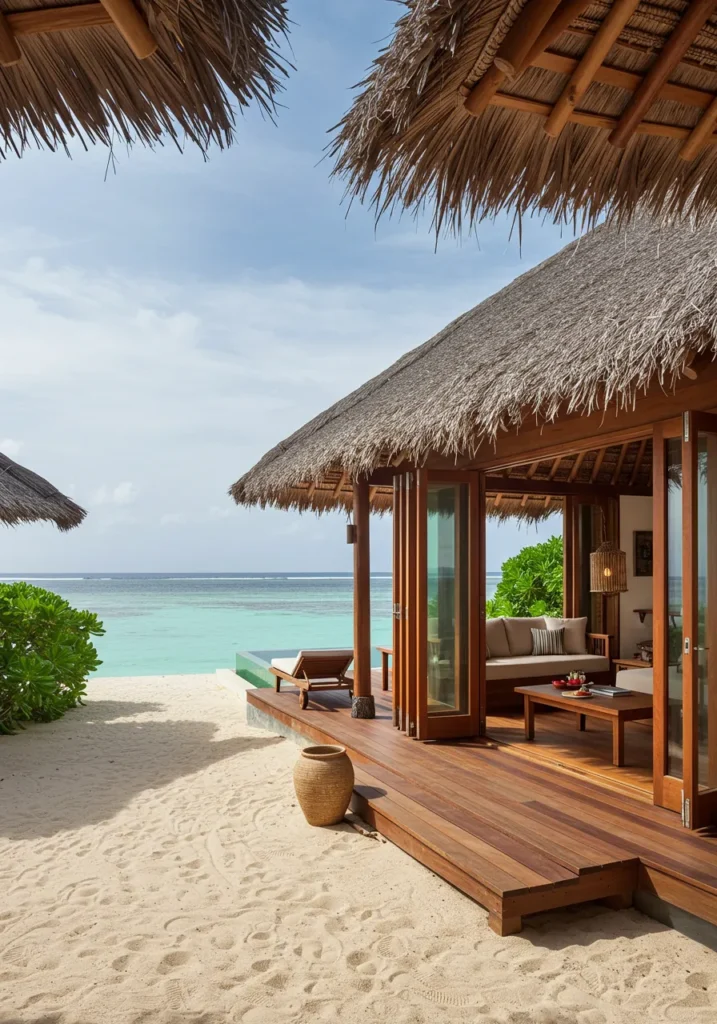 This charming beachfront villa embraces a relaxed, tropical design with natural wood accents and a thatched roof that creates a warm, inviting atmosphere. The open floor plan, with large folding doors that seamlessly connect the interior to the outdoor space, invites the natural light and ocean breeze to flow freely throughout. The deck, crafted from rich wood, extends right onto the sand, allowing easy access to the water and offering a perfect spot for lounging in the sun. Surrounded by lush greenery and with a few palm trees in the backdrop, this villa feels like the perfect tropical paradise.