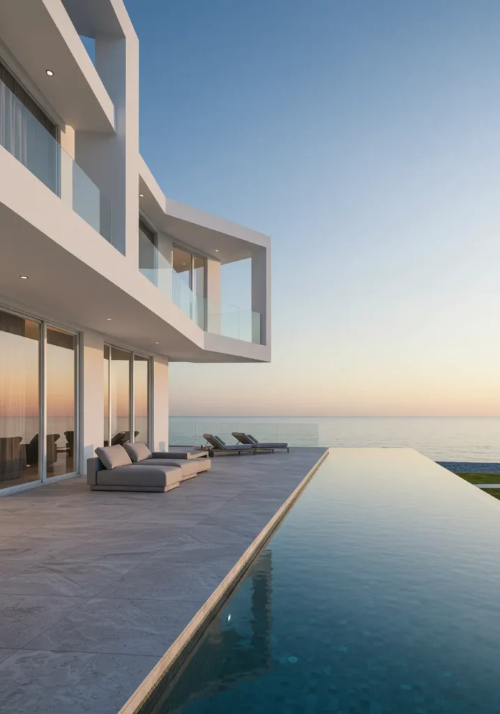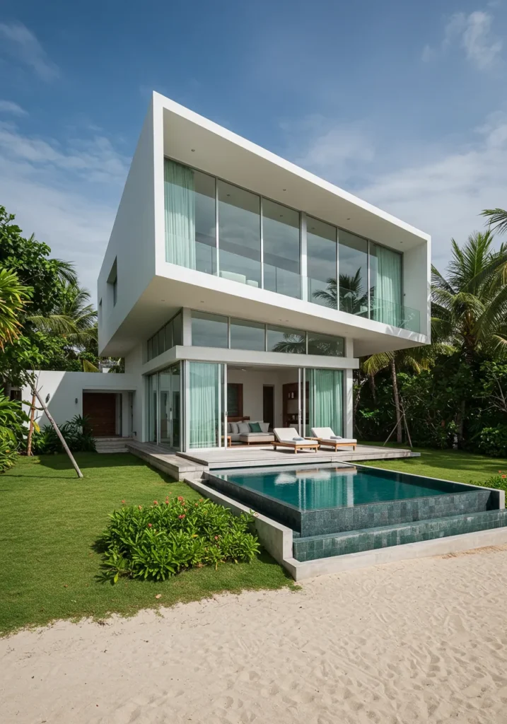 This modern beach villa combines sleek, clean lines with a bold architectural style, creating an incredibly chic and luxurious look. The open space is lined with large glass windows, allowing for sweeping views of the ocean while maintaining an airy, minimalist aesthetic. The standout feature of this villa is its infinity pool, which perfectly blends with the horizon and enhances the sense of openness. With its smooth surfaces, elegant furniture, and crisp design, this villa is a true masterpiece of contemporary architecture.