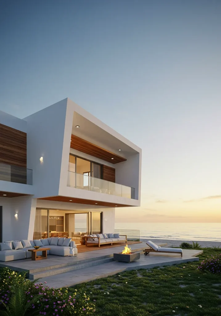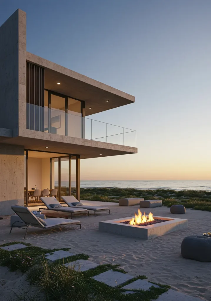 I absolutely love how this design feels both bold and inviting. The minimalist architecture gives it a modern edge, but the outdoor fire pit area adds warmth and a sense of comfort. The way the villa is set against the beach, with the calming sound of the waves and that stunning view, makes this feel like the ultimate escape. It’s the perfect spot to unwind and enjoy both the serenity of the beach and the chic design of the villa—what more could you ask for in a beachside retreat?