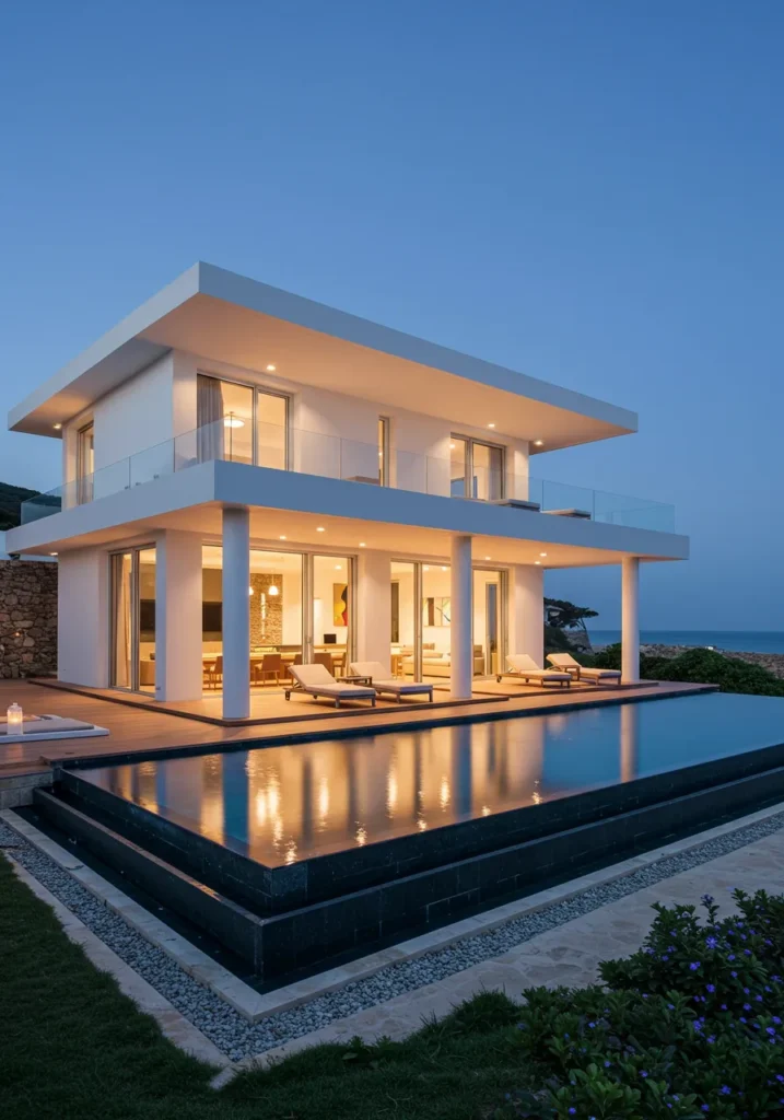 This ultra-modern beach villa features a minimalist, clean-cut design that combines luxury with functionality. The villa’s crisp white exterior is paired with expansive glass windows, providing unobstructed views of the ocean and natural surroundings. The sleek, black reflective pool enhances the sophisticated aesthetic, perfectly mirroring the building’s structure. Set on a raised platform, the villa’s open spaces seamlessly blend indoors with the outdoors, creating an atmosphere of serenity and elegance.