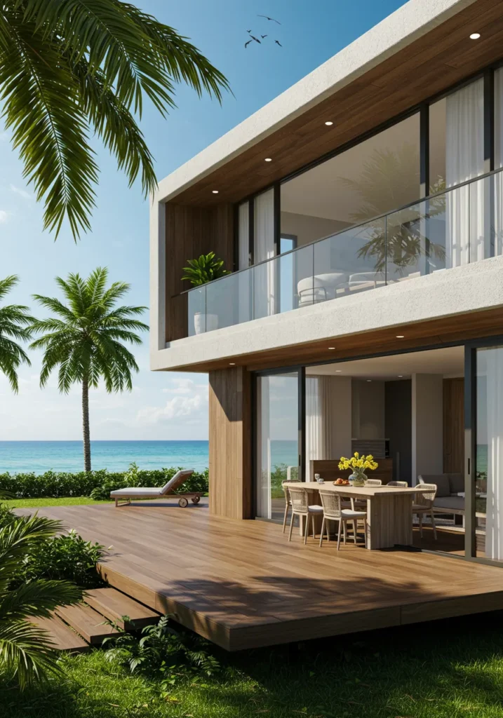 This luxurious modern beach villa effortlessly blends contemporary style with tropical elegance. The structure stands out with sleek, straight lines, clean white surfaces, and large glass windows that open up to the ocean views. A wooden deck wraps around the villa, adding warmth to the minimalistic design, while the surrounding palm trees and lush greenery provide a refreshing contrast to the starkness of the architecture. With an inviting outdoor seating area and a perfect view of the beach, the villa embodies modern beach living at its finest.