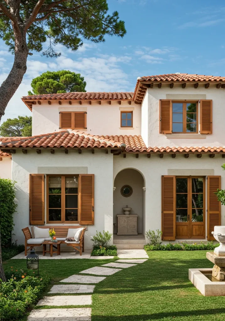 This beautiful Mediterranean-style beach villa combines classic charm with modern comfort. The warm terracotta roof contrasts beautifully with the whitewashed exterior, and the wooden shutters add a pop of natural color. The front courtyard is a cozy, inviting space, with a lovely stone pathway leading to a quaint sitting area, perfect for enjoying the peaceful surroundings. The villa’s design embraces the Mediterranean influence with its elegant arches and decorative stonework, providing both character and functionality.
