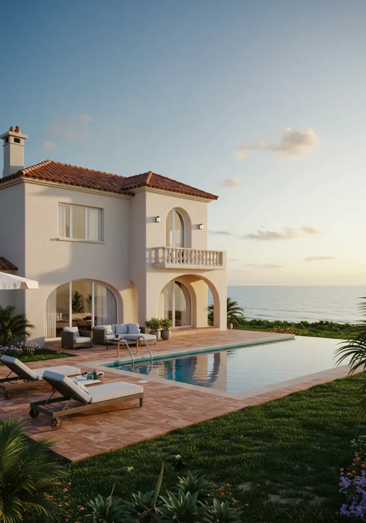 I absolutely love how this villa combines the beauty of Mediterranean design with the relaxed beach vibe. The terracotta roof and arched windows give it that timeless, rustic charm, while the open, airy terrace and luxurious pool area create the ultimate laid-back living space. It feels like the perfect mix of elegance and comfort, making it the ideal place to unwind and enjoy the coastal breeze. I’m seriously dreaming of lounging here all day long, sipping on something refreshing while taking in those stunning views!