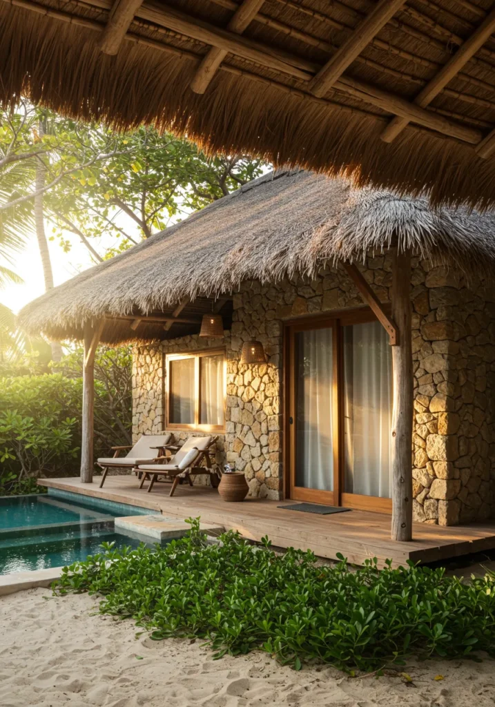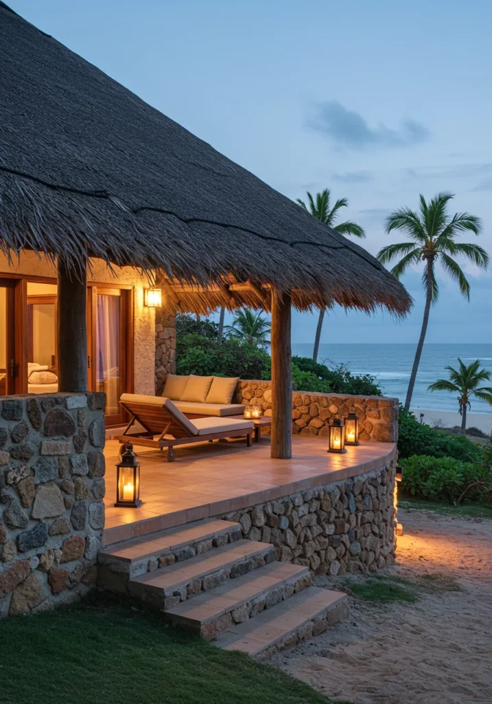 This charming beach villa is all about blending rustic charm with the raw beauty of nature. The thatched roof adds a tropical vibe, while the stone-clad walls provide texture and earthiness to the design. The spacious front porch is framed by sturdy wooden beams, offering an inviting space to lounge and take in the views of the ocean. Soft lighting from lanterns creates a warm, cozy atmosphere as evening settles in, enhancing the villa’s intimate feel.