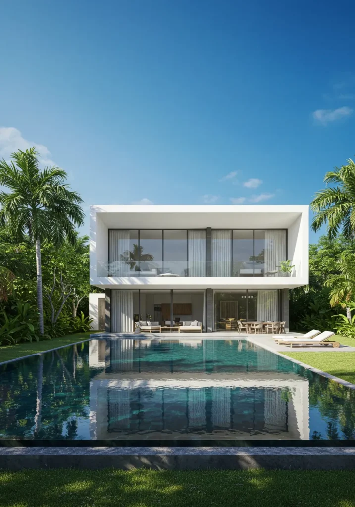 This contemporary beach villa boasts a clean, modern design that combines open space and natural materials to create a luxurious yet relaxed atmosphere. With expansive glass windows and wide sliding doors, the house offers unobstructed views of the ocean, seamlessly blending the indoor and outdoor spaces. The sleek pool reflects the stunning villa, perfectly complementing the minimalist design. The lush greenery and surrounding palm trees enhance the tropical vibe, creating a peaceful and idyllic setting.