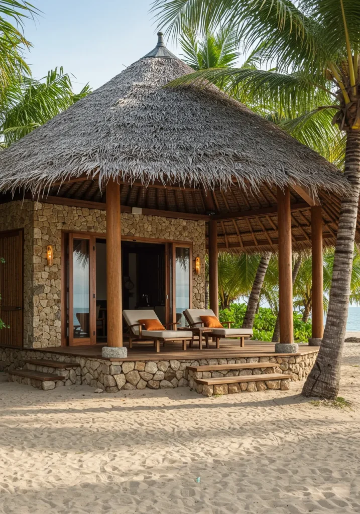 This tropical beach hut is the perfect fusion of rustic charm and coastal elegance. Its thatched roof made of natural materials like straw complements the stone-clad walls, offering a rustic yet refined look. The wooden pillars hold up the expansive overhang, which seamlessly merges the indoors with the outside, while the wood decking adds warmth and sophistication. The view is breathtaking, with palm trees swaying gently in the breeze and the beach just steps away.