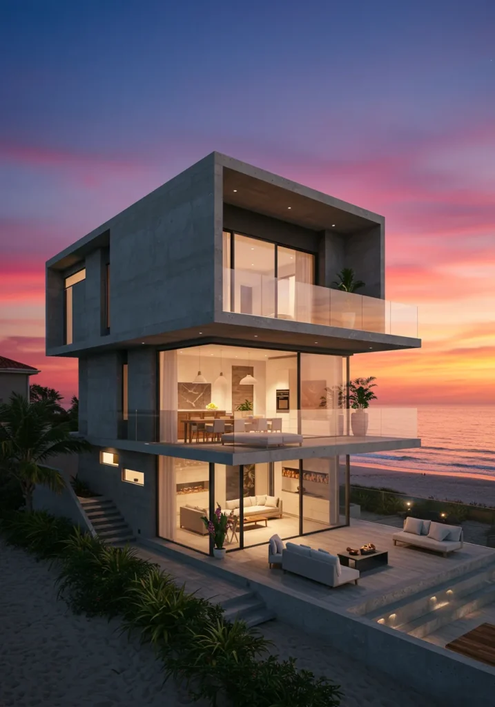 This sleek and contemporary beach villa is a perfect blend of minimalist architecture and luxurious beachfront living. The raw concrete exterior contrasts beautifully with the soft ocean waves just beyond the property. Floor-to-ceiling windows allow uninterrupted views of the sea, while the spacious outdoor patio is the perfect spot to enjoy the sunset. With sharp, angular lines and a floating design, the villa feels both futuristic and grounded, with simple yet stunning landscaping that enhances its bold look.