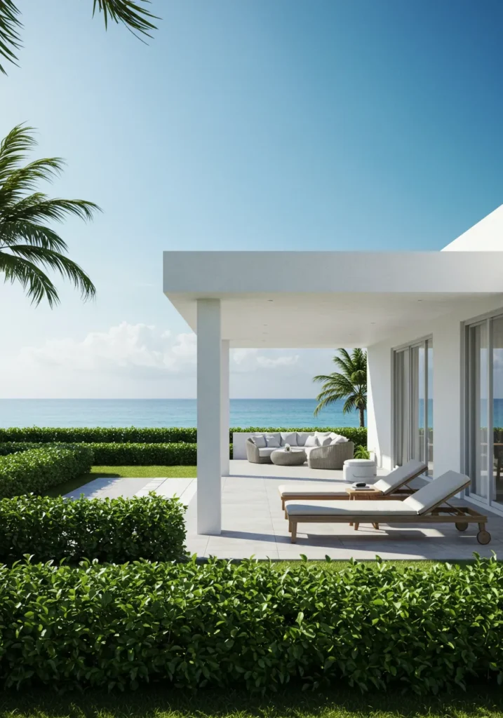 What I love about this design is how effortlessly it creates a relaxed atmosphere while still feeling ultra-chic. The simplicity of the white walls and modern furniture allows the beach views to really shine, and I love how the outdoor space feels like an extension of the living room. It’s the perfect spot to enjoy the ocean breeze, whether you’re lounging in the sun or sipping a cold drink at sunset. Honestly, it feels like the ideal place to unwind and just enjoy the beauty of nature from the comfort of home.