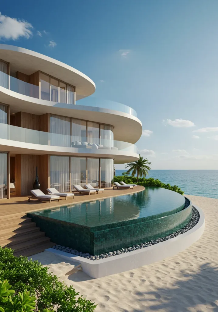 What I love about this design is how effortlessly chic it feels. The clean, curved lines of the building make it stand out, while the infinity pool gives it that extra touch of luxury. It’s the perfect mix of bold and serene. The idea of lounging by the pool, enjoying the ocean breeze, and having such a stunning view right at your doorstep sounds like an absolute dream. This villa is a perfect example of modern design meeting beachside bliss!