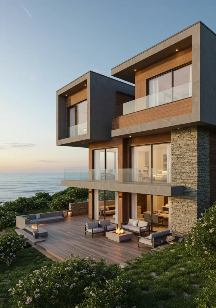 This striking beach villa features a contemporary design that perfectly blends sleek concrete with natural wood accents. The floor-to-ceiling glass windows offer panoramic views of the ocean, while the unique stone detail at the base of the structure gives it a grounded, earthy feel. The spacious terrace is designed with both luxury and comfort in mind, complete with a cozy seating area around a fire pit, making it the ideal place to enjoy the sunset with friends and family. The lush greenery surrounding the villa adds to the sense of privacy, creating a serene atmosphere.