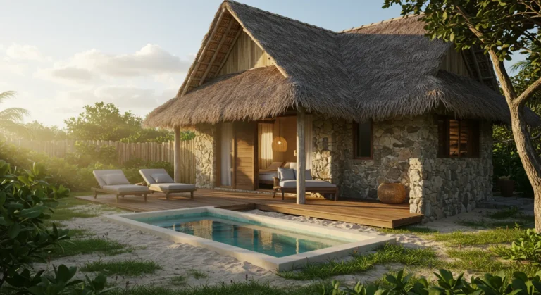 I just love how this villa exudes such a laid-back, cozy vibe. It’s like the perfect beach getaway that makes you feel at home from the moment you arrive. The mix of rustic stone with the natural wood and woven details is so warm and earthy, giving it a really grounded, welcoming feel. Plus, that poolside spot by the sand looks absolutely dreamy—imagine sipping a cold drink there as the sun sets. It’s simple, elegant, and the perfect spot to unwind in nature’s beauty!