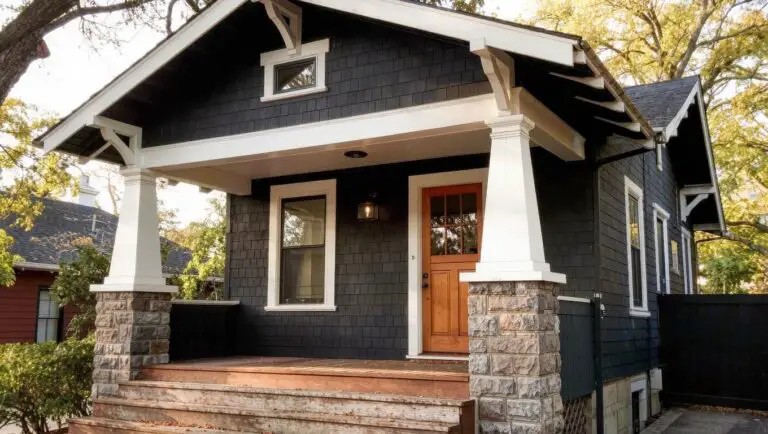 The cool undertone sits right with stone pillars and wood steps. White trim keeps it crisp. Add a warm orange door for contrast. It works best on Craftsman homes… just check your light first to avoid it looking too heavy.
