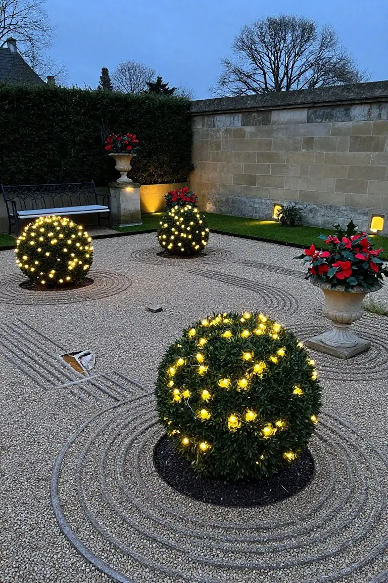Try this in a structured garden with boxwood borders or parterres where you want some structure. Plant dwarf conifers in pots or beds, then loop the lights loosely so they show through. Pair with path lanterns for steady glow. It suits smaller yards or formal setups best. Just stick to one type of light color to avoid clashing.